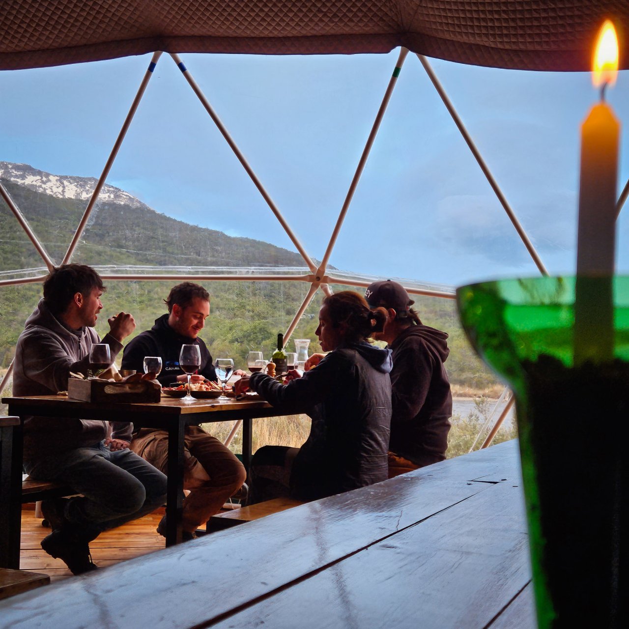 Descubriremos antiguos sitios arqueológicos donde aprenderemos sobre las culturas nativas y nos detendremos en los mismos lugares donde estas familias vivieron por siglos, escuchando los mismos sonidos del bosque y el mar que ellos percibieron. Al llegar el atardecer, nos dirigiremos a un acogedor domo estructural para disfrutar de una cena gourmet especialmente diseñada con ingredientes regionales. Allí, a la luz de las velas y frente a la silueta del Cerro Cóndor, compartiremos una velada cálida que conecta la historia, la naturaleza y la gastronomía del fin del mundo.